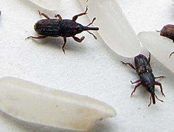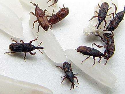 米象,俗稱蛘子,歸屬鞘翅目象蟲科,是貯藏谷物的主要害蟲。成蟲嚙食谷粒,幼蟲蛀食谷粒內部。危害米、、麥、玉米、高粱等。